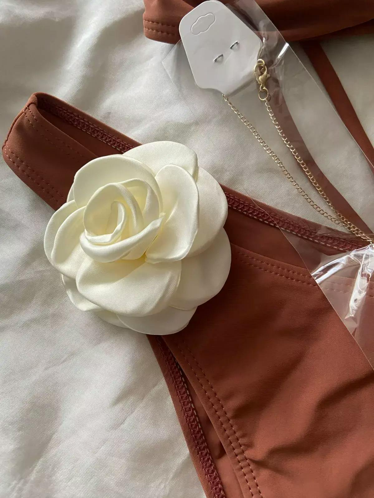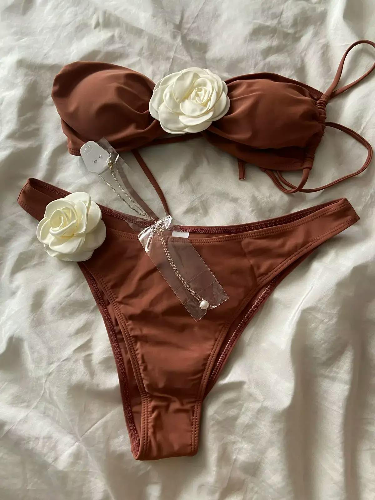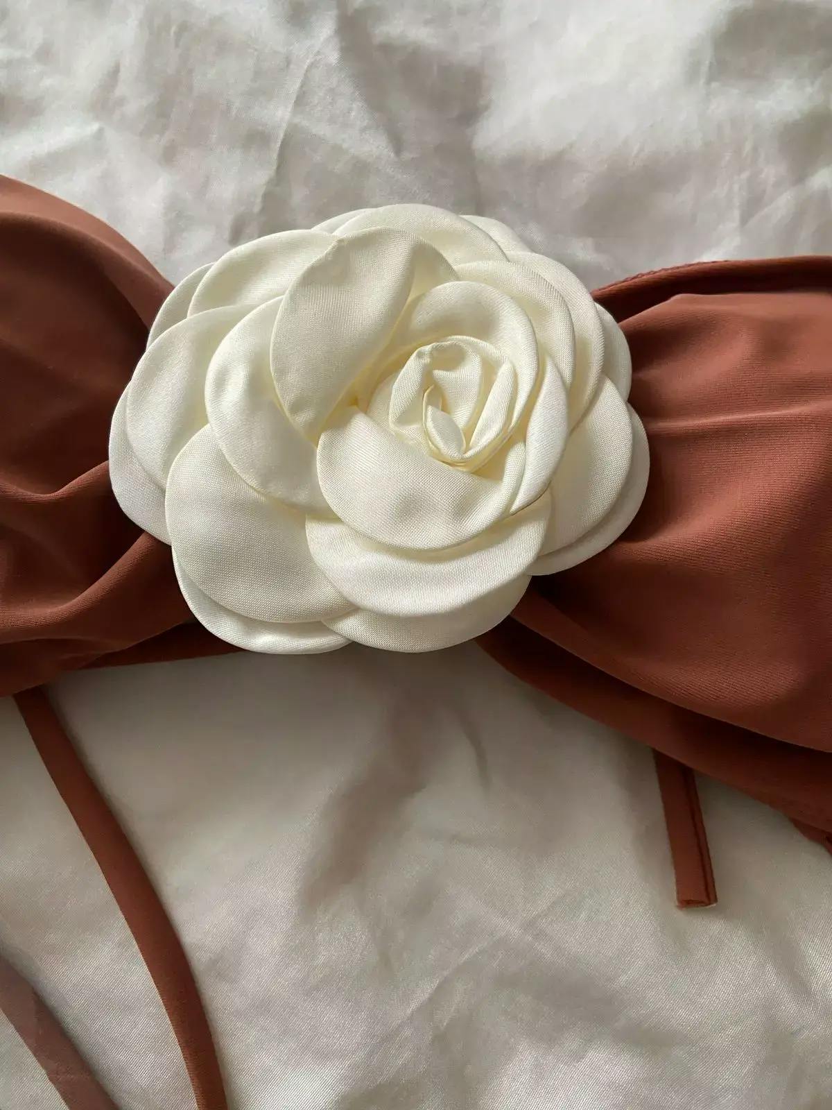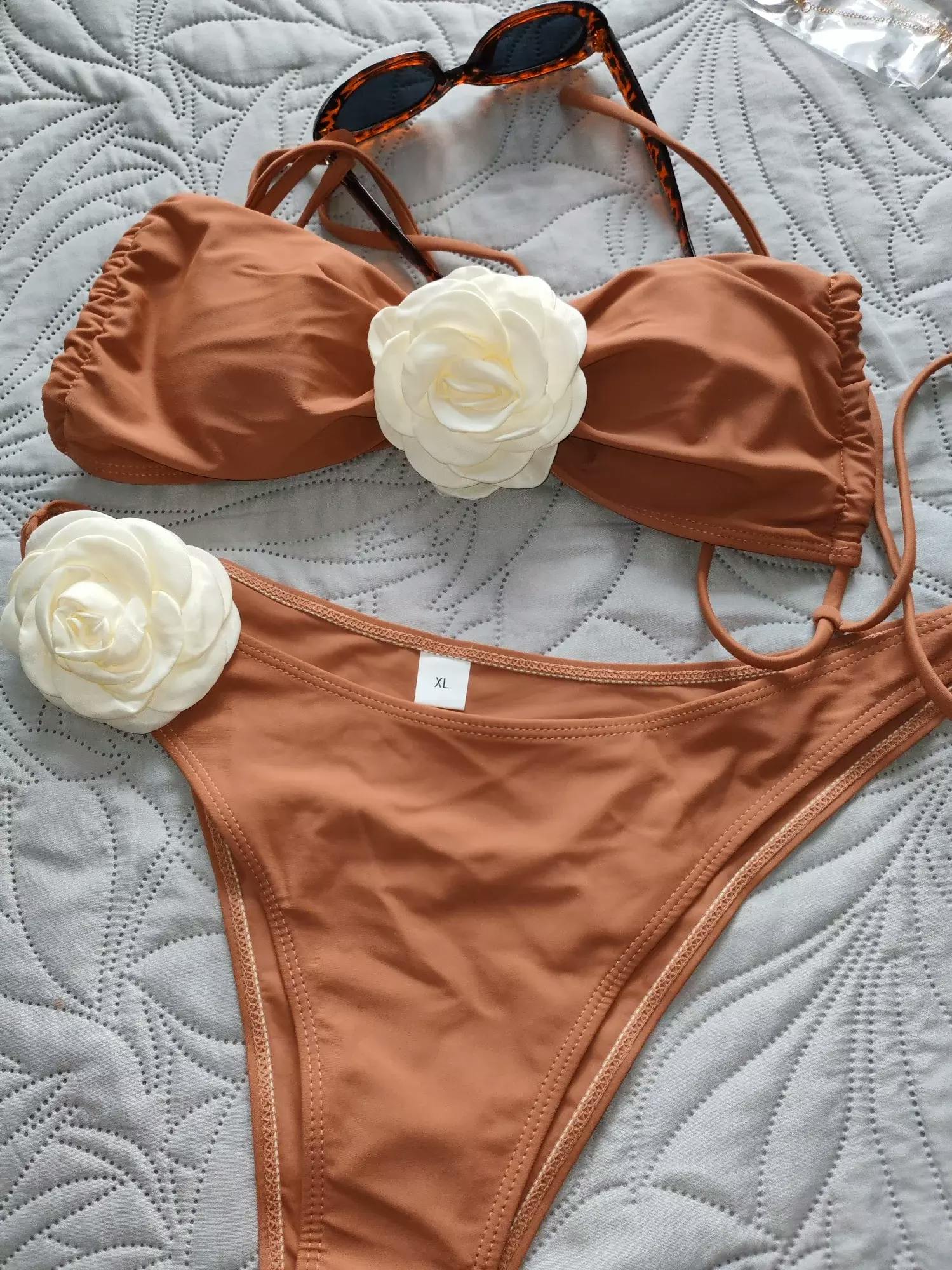 Bikini bez ramiączek z kwiatowym detalem to praktyczne rozwiązanie na gorące dni. Wykonane z trwałego materiału, zapewnia komfort i elastyczność, nie ograniczając ruchów podczas kąpieli. Kwiatowe detale dodają subtelnej elegancji, co czyni ten strój odpowiednim wyborem na różnorodne okazje, od relaksu na plaży po aktywności w basenie. Konstrukcja bez ramiączek pozwala na równomierną opaleniznę, a wysokiej jakości tkanina zapewnia odporność na działanie wody i promieni słonecznych. Idealne dla osób ceniących połączenie funkcjonalności i stylu.