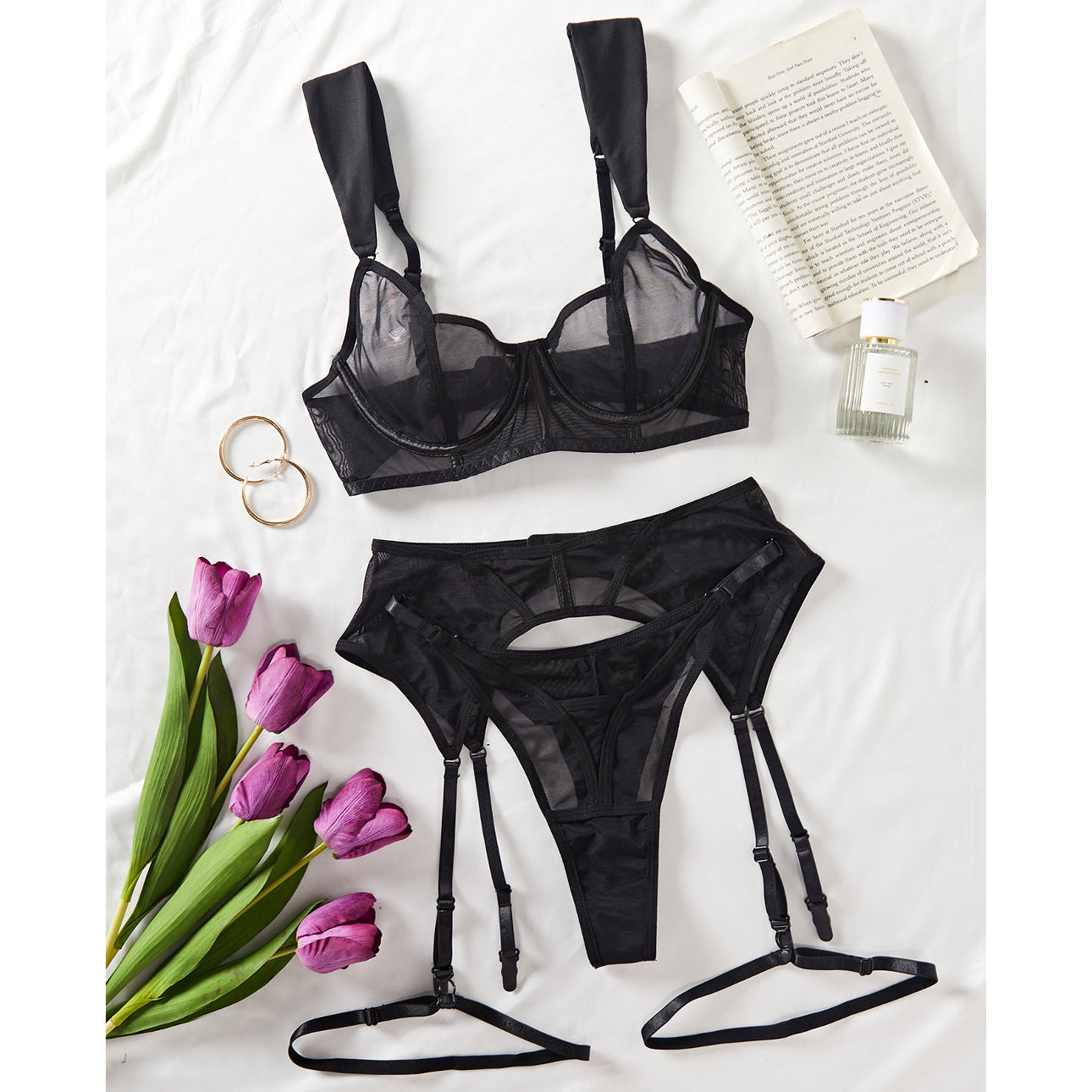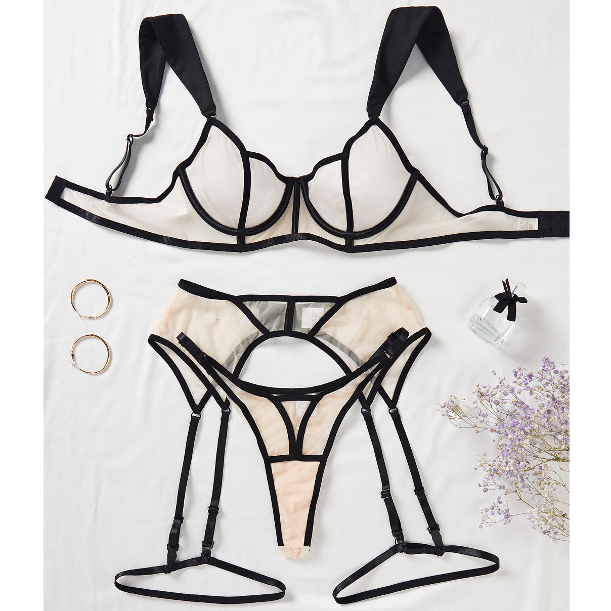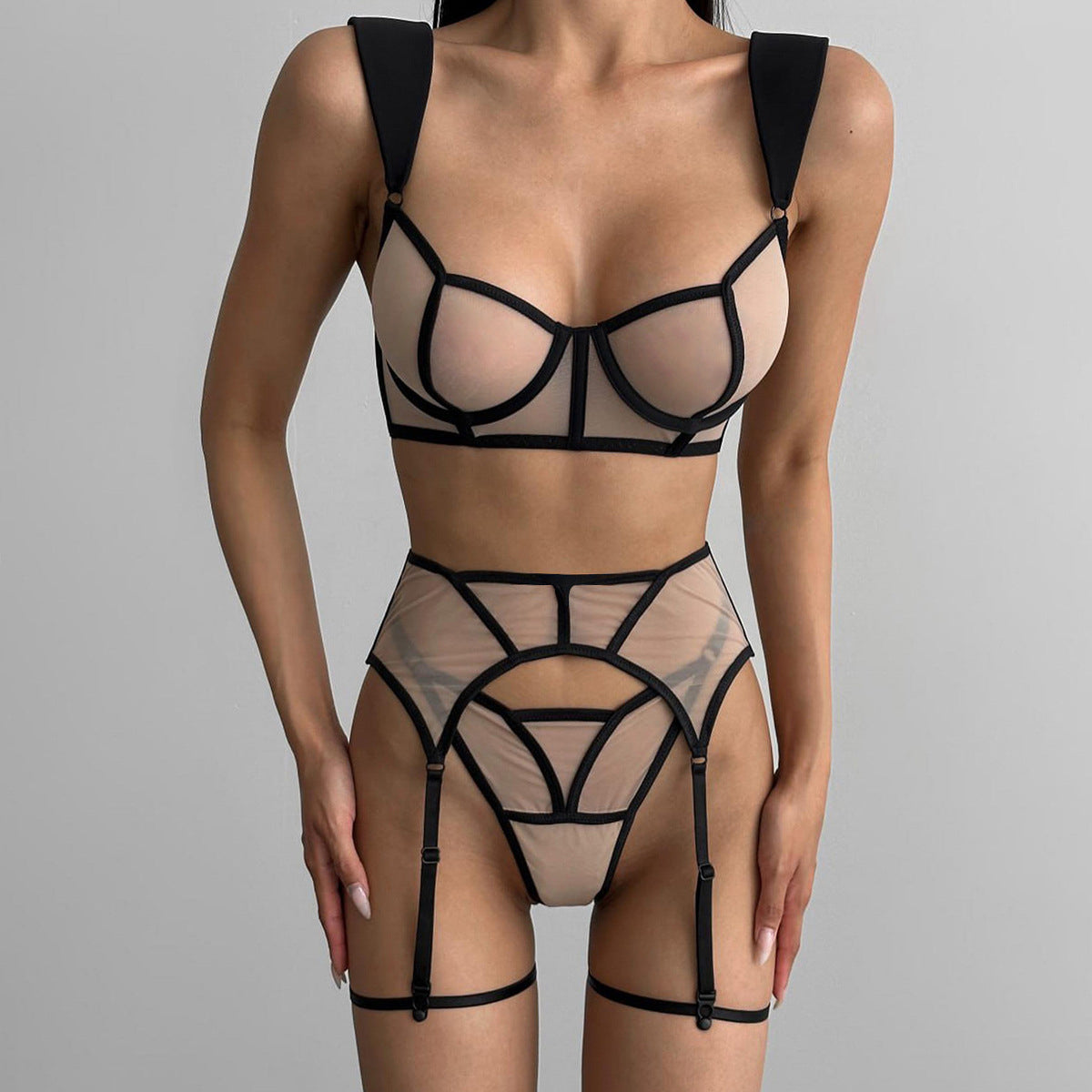 Czteroczęściowy komplet bielizny zaprojektowany z myślą o funkcjonalności i estetyce, wykonany został z miękkich, przyjemnych w dotyku materiałów, które zapewniają wygodę noszenia przez cały dzień. Każdy z elementów, dzięki precyzyjnemu krojowi, subtelnie podkreśla kobiecą sylwetkę. Regulowane ramiączka umożliwiają dostosowanie do indywidualnych potrzeb, a staranne wykończenie dodaje całości elegancji. Idealny zarówno na wyjątkowe okazje, jak i do codziennych stylizacji, łącząc komfort z ponadczasowym stylem.