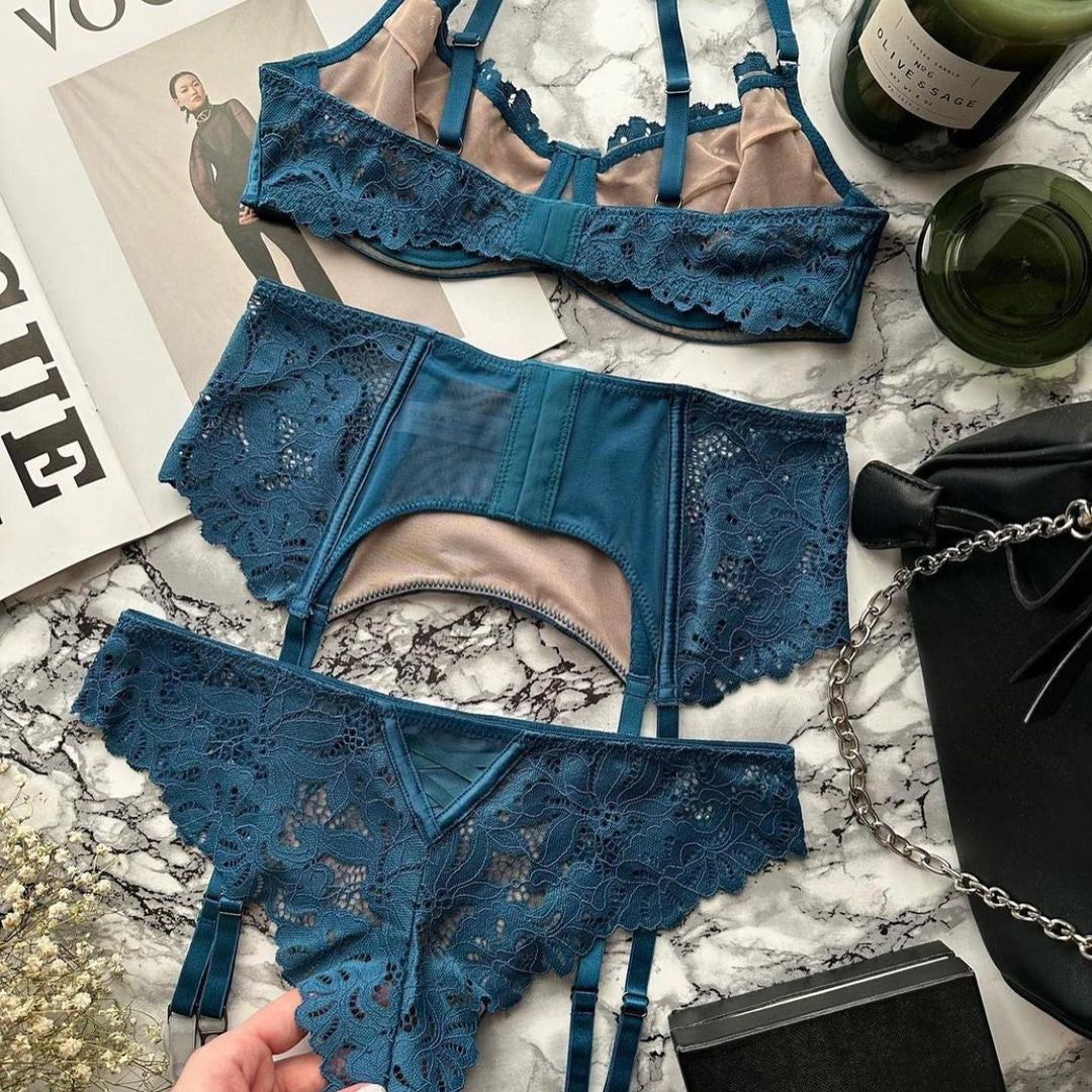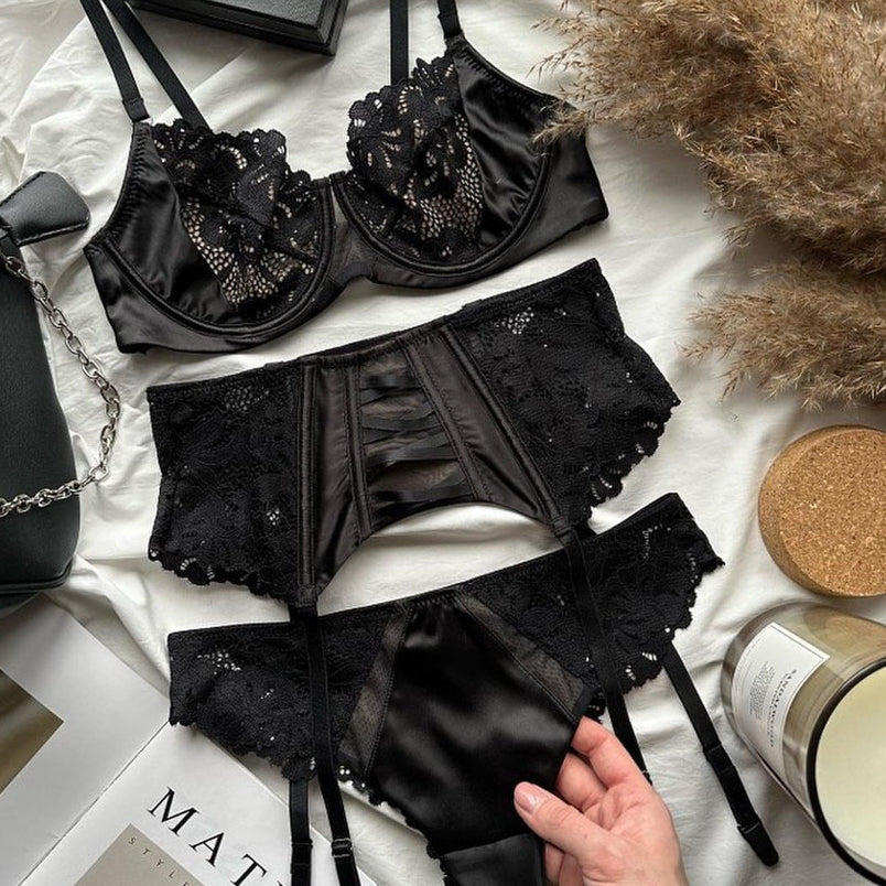 Zmysłowy zestaw bielizny dla kobiet obejmuje biustonosz, pas do pończoch i majtki, starannie zaprojektowane z myślą o komforcie i estetyce. Elementy zestawu wykonano z delikatnych koronek i satyny, co zapewnia subtelny wygląd oraz przyjemność noszenia. Biustonosz oferuje doskonałe dopasowanie, a pas do pończoch dodaje elegancji. To przemyślane połączenie materiałów i krojów podkreśla indywidualny styl, czyniąc zestaw odpowiednim na wyjątkowe okazje oraz codzienne użytkowanie.