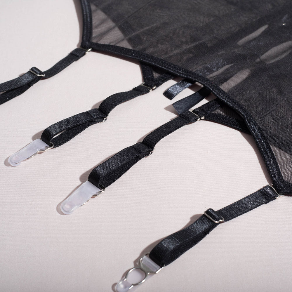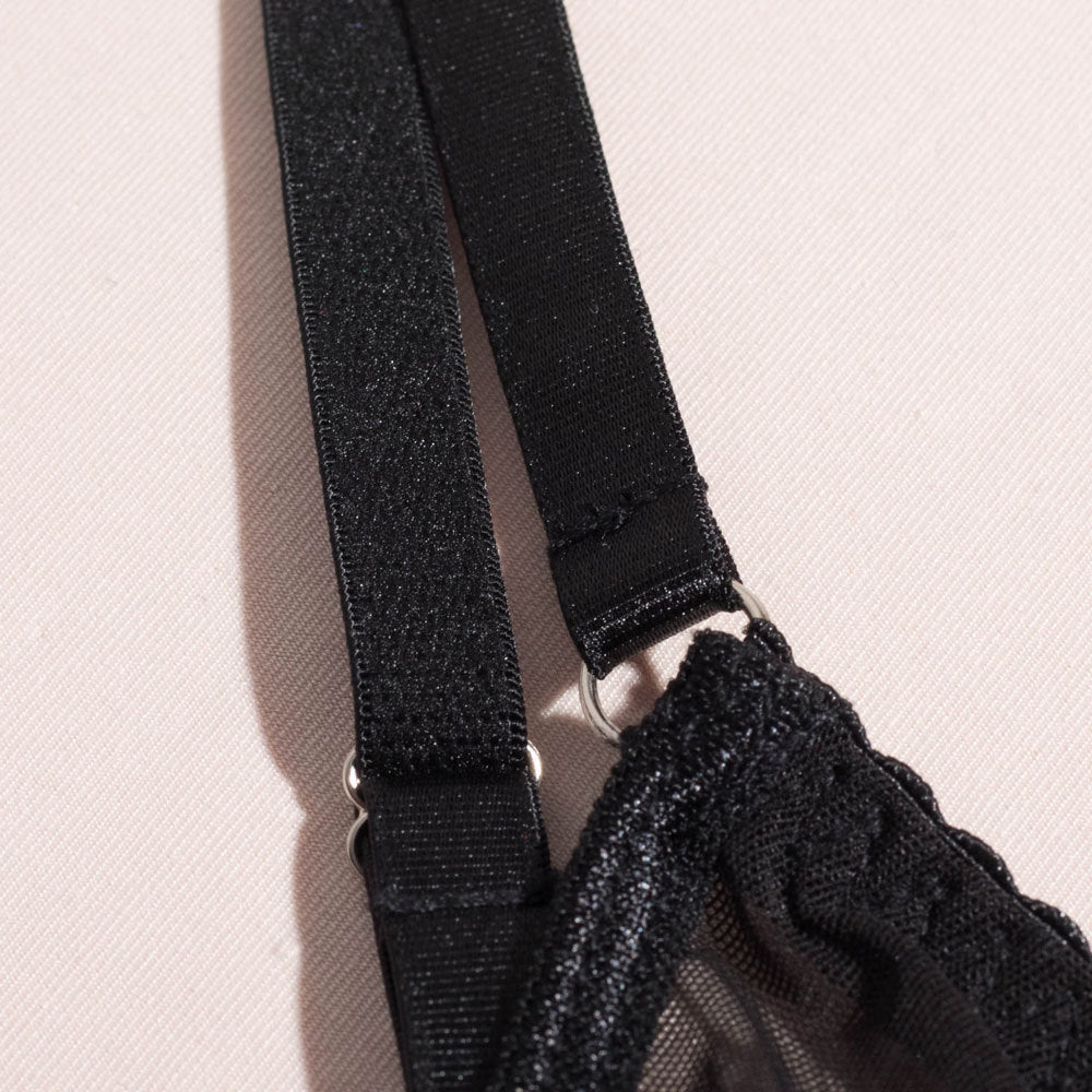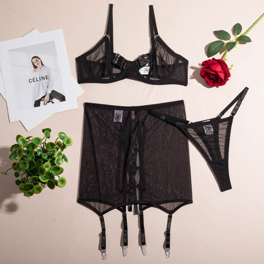 Trzyczęściowy zestaw bielizny wyróżnia się delikatnym wykonaniem i starannym wykończeniem. Składa się z biustonosza, majtek i pasa do pończoch, które razem tworzą harmonijną całość. Materiał, z którego wykonano zestaw, to przewiewna i miękka tkanina, zapewniająca komfort noszenia przez cały dzień. Konstrukcja biustonosza wspiera i modeluje biust, podczas gdy majtki i pas podkreślają talię oraz biodra. Idealny na specjalne okazje, zestaw łączy funkcjonalność z estetyką, gwarantując elegancki wygląd i wygodę użytkowania.