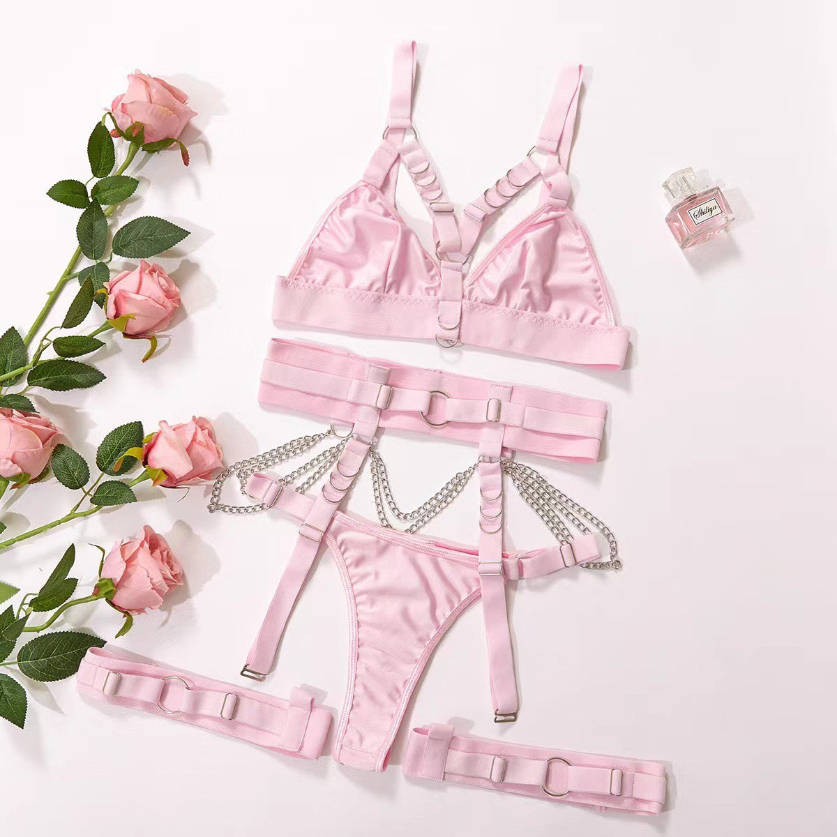 Trzyczęściowy komplet bielizny, wykonany z wysokiej jakości materiałów, oferuje doskonałe połączenie komfortu i stylu. W skład zestawu wchodzą biustonosz, figi i pas do pończoch, które razem tworzą spójną całość. Regulowane paski umożliwiają precyzyjne dopasowanie do sylwetki, co podnosi wygodę użytkowania. Subtelne detale, takie jak koronkowe wykończenia, dodają elegancji i wyrafinowania. Komplet ten sprawdzi się jako element garderoby na wyjątkowe okazje, podkreślając indywidualny styl i osobowość.