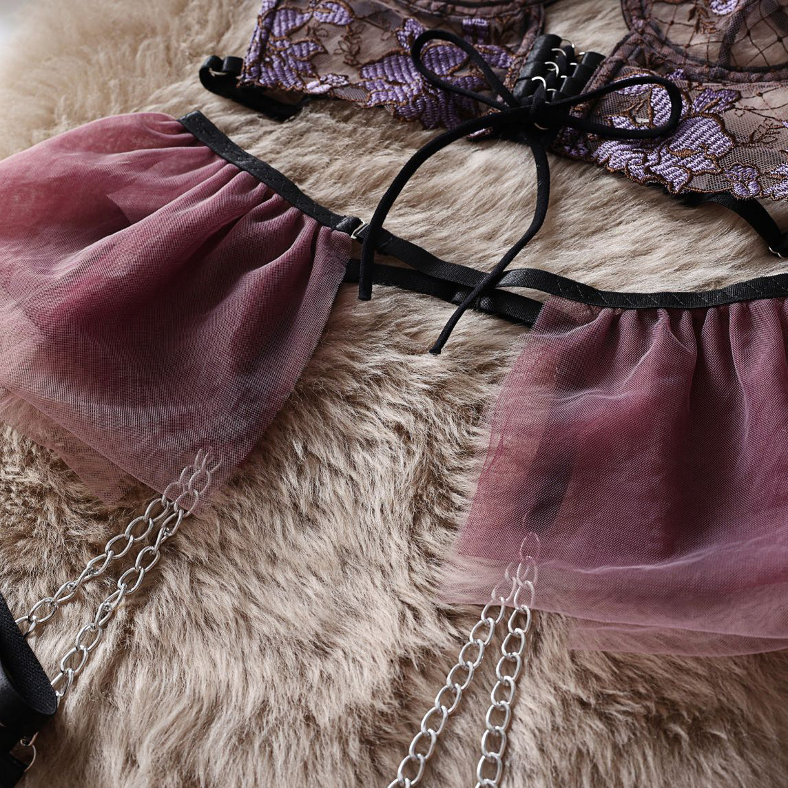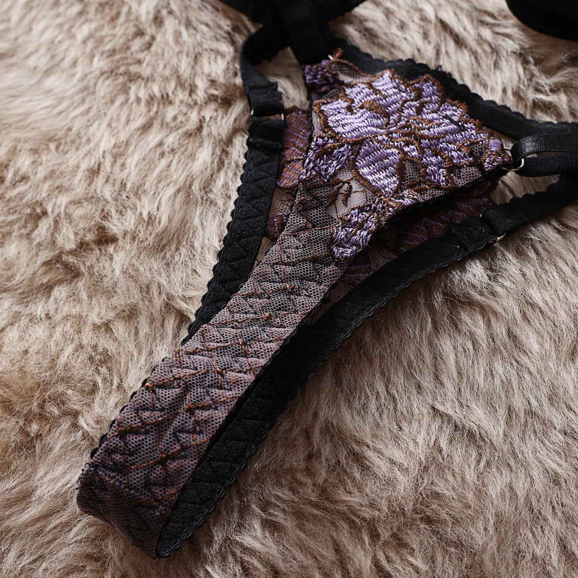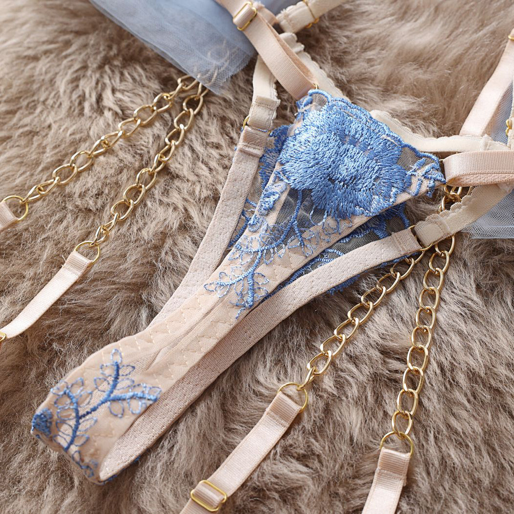 Ten komplet bielizny charakteryzuje się bogatymi zdobieniami, które wyróżniają się misternym wykonaniem. Stworzony z dbałością o szczegóły, oferuje połączenie delikatnych koronek z odrobiną ekstrawagancji, co czyni go odpowiednim wyborem na wyjątkowe okazje. Wysokiej jakości materiały zapewniają komfort noszenia oraz trwałość, a unikalne wzory dodają luksusowego charakteru. Idealny dla osób ceniących sobie elegancję i styl, komplet podkreśla indywidualność, nie rezygnując przy tym z funkcjonalności.