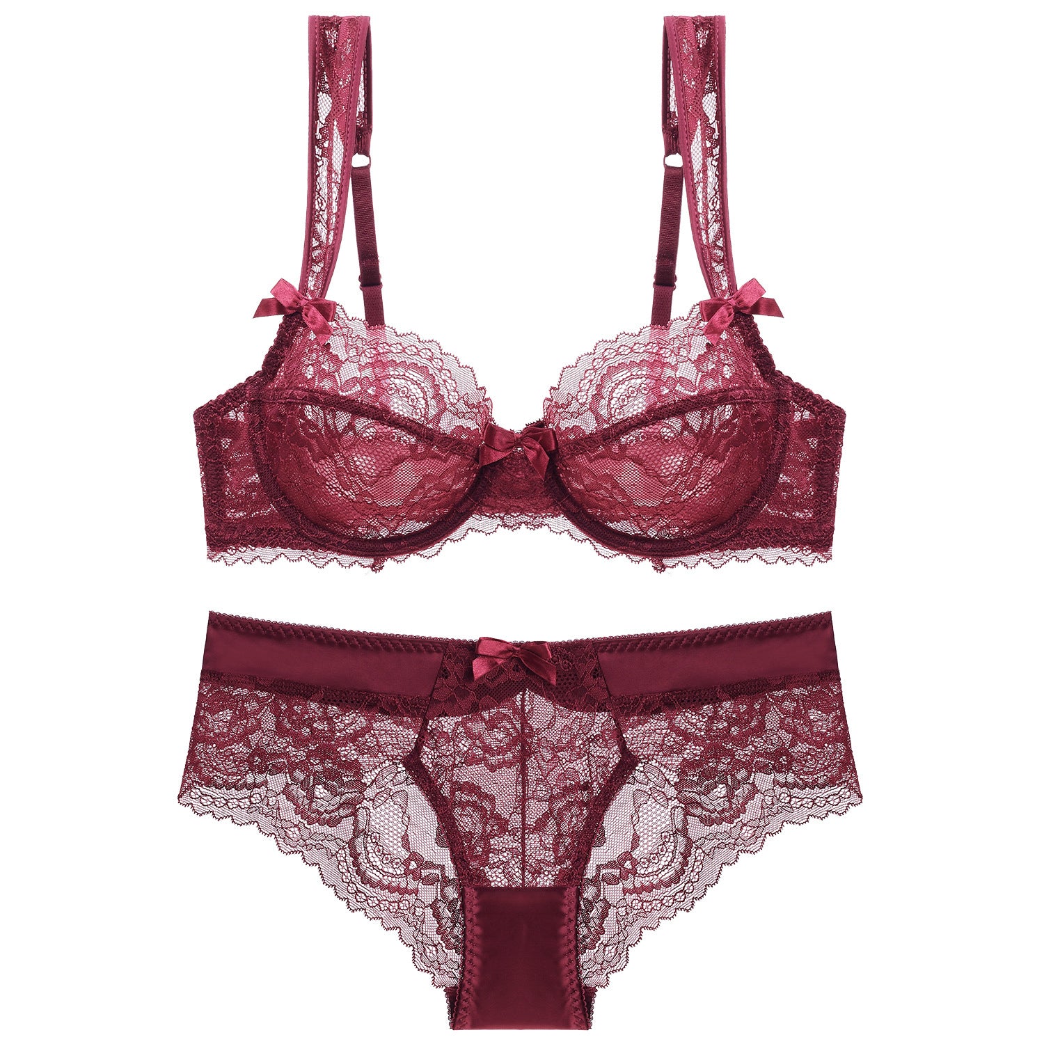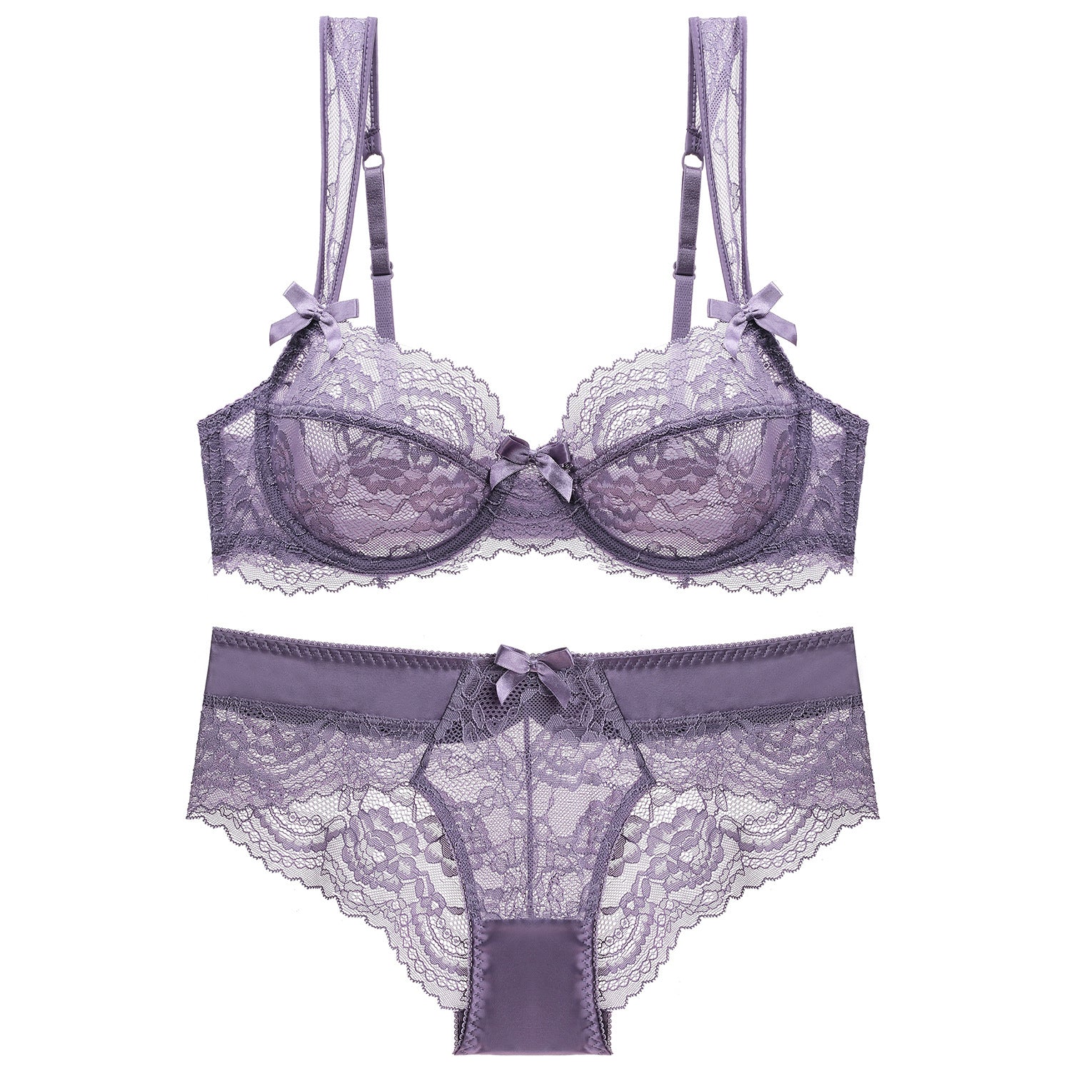 Ten komplet bielizny z koronki wyróżnia się ultracienką konstrukcją, która delikatnie otula ciało, zapewniając jednocześnie wygodę i subtelność. Misternie zdobiona koronka gwarantuje estetyczny wygląd, a precyzyjne wykonanie podkreśla walory sylwetki. Biustonosz, dzięki odpowiedniemu krojowi, oferuje stabilne wsparcie. Dołączone majtki idealnie współgrają z całością, tworząc spójną kompozycję. Doskonały wybór na specjalne okazje, gdy liczy się elegancja i komfort.