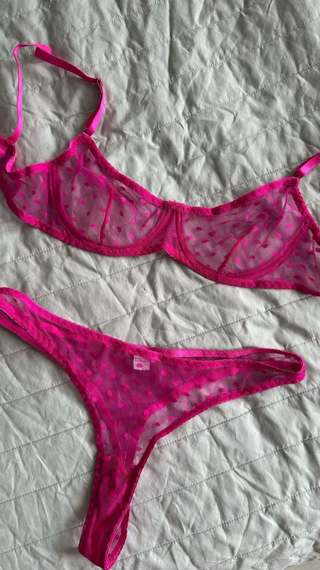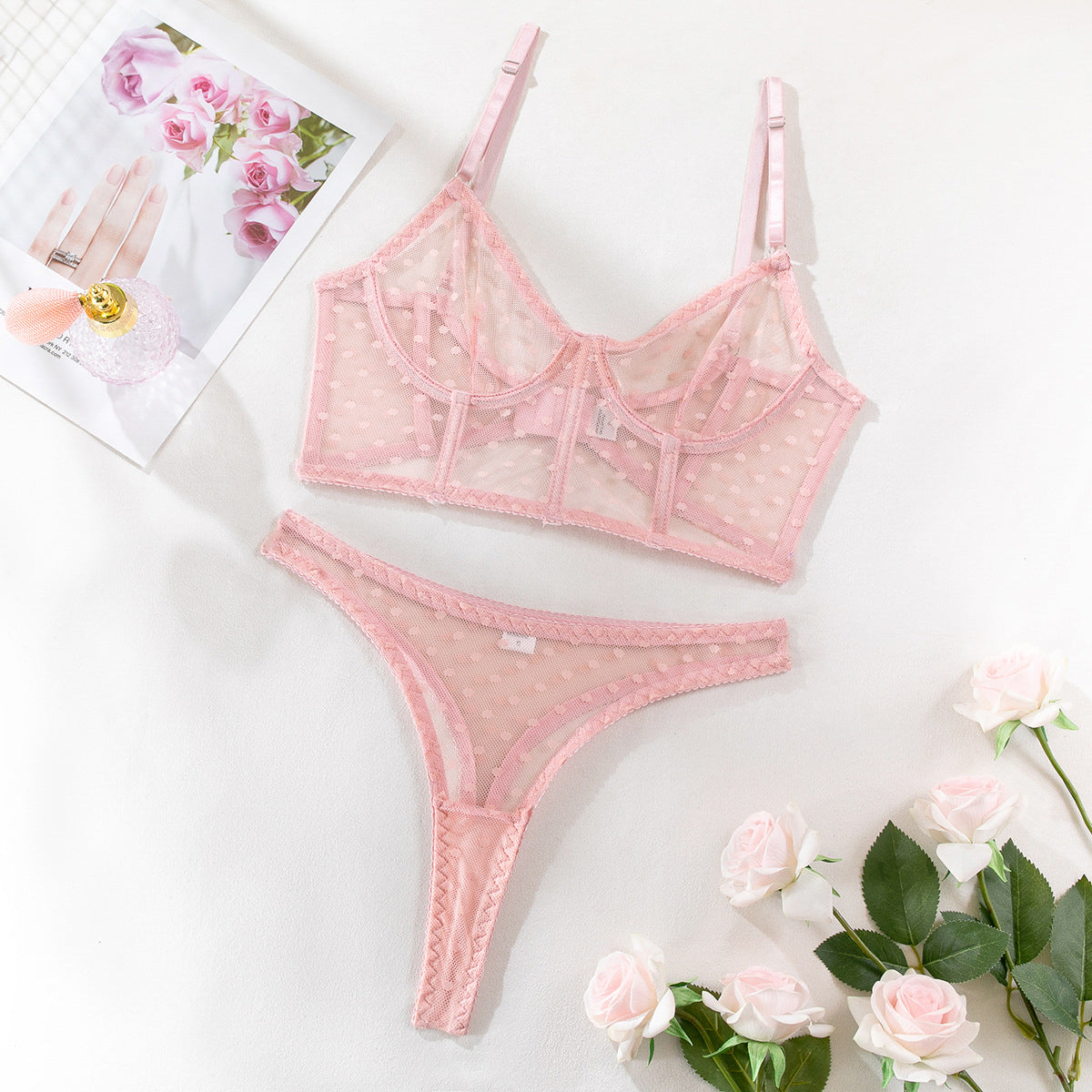 Komplet bielizny, składający się z biustonosza i stringów, wykonany z delikatnej siateczki, zapewnia komfort i subtelnie podkreśla sylwetkę. Biustonosz modeluje kształt biustu, a stringi dobrze dopasowują się do figury, eksponując jej atuty. Zestaw idealnie nadaje się na romantyczne wieczory, ale również świetnie sprawdzi się pod codziennym strojem, oferując wygodę i elegancję. Materiał bielizny jest przewiewny i przyjemny w dotyku, co czyni go praktycznym wyborem na każdą okazję.