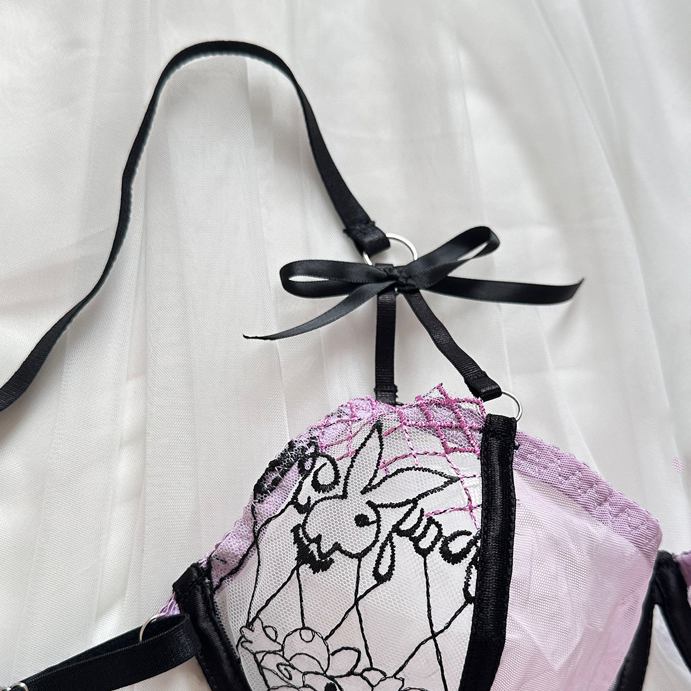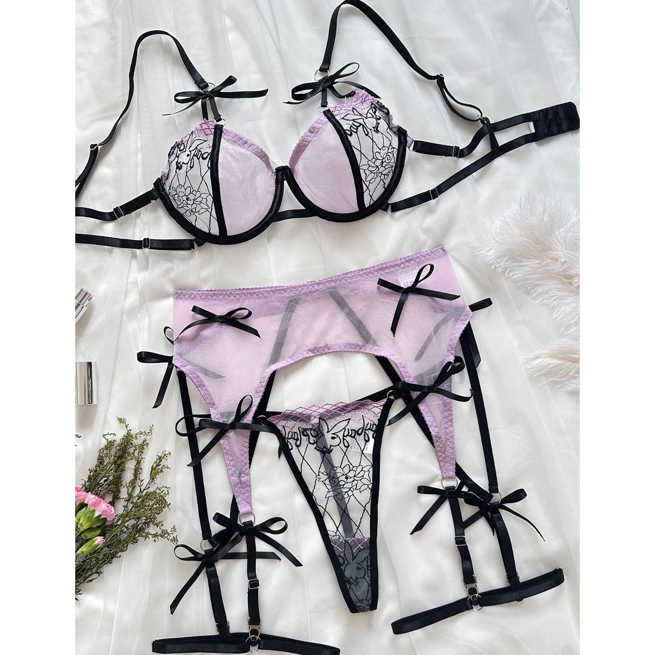 Zestaw prześwitującej bielizny wyróżnia się eleganckim designem oraz starannie dobranymi materiałami, które zapewniają wygodę i estetykę. Delikatna koronka oraz subtelne kokardki podkreślają wyjątkowy charakter zestawu, idealnie dopasowując się do kształtów ciała. Prześwitująca tkanina nadaje całości zmysłowego wyglądu, doskonałego na specjalne okazje. Wysoki standard wykonania gwarantuje trwałość i komfort użytkowania, czyniąc ten zestaw doskonałym wyborem dla osób ceniących styl i jakość w codziennej garderobie.