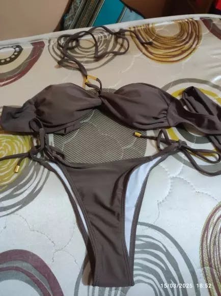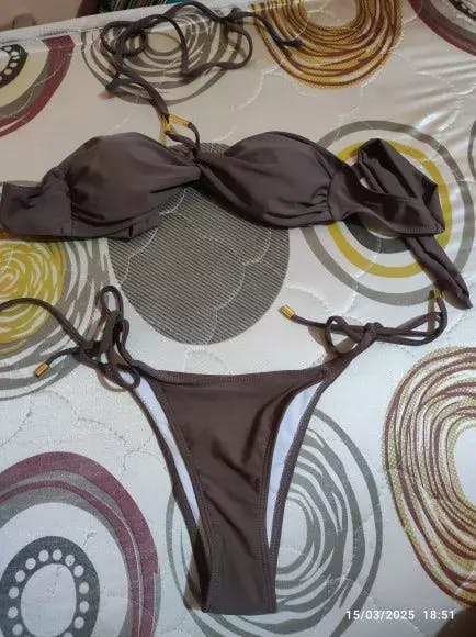 Bikini z topem bandeau charakteryzuje się prostą formą, która uzupełnia letnie stylizacje plażowe. Uszyte z elastycznego materiału, zapewnia idealne dopasowanie do ciała, co przekłada się na komfort noszenia. Top bandeau nie posiada ramiączek, co pozwala na równomierne opalanie ramion. Komplet ten sprawdzi się zarówno podczas relaksu na leżaku, jak i aktywności w wodzie, łącząc w sobie nowoczesny styl i funkcjonalność.