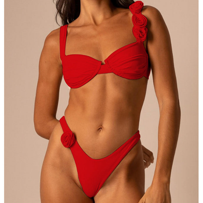 Dwuczęściowy strój kąpielowy z motywem róż łączy funkcjonalność z estetyką. Górna część, ozdobiona subtelnymi różami na pasku, wyposażona jest w wyprofilowane miseczki, które zapewniają solidne podtrzymanie. Dół z wysokim stanem optycznie wydłuża nogi, podkreślając atuty sylwetki. Materiał, z którego wykonano strój, jest odporny na działanie chloru i promieni UV, co zapewnia trwałość kolorów. Przemyślane detale gwarantują komfort noszenia, czyniąc go odpowiednim wyborem na różne aktywności wodne.