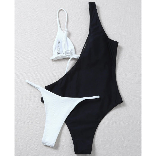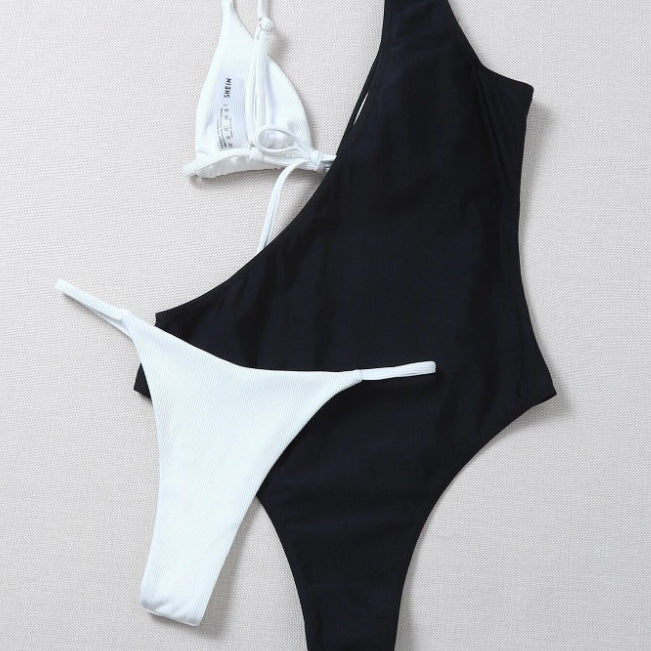 Asymetryczny strój kąpielowy z prążkowanego materiału wyróżnia się nowoczesnym krojem, który efektownie podkreśla sylwetkę. Wykonany z materiałów odpornych na chlor i słoną wodę, co zapewnia trwałość i estetyczny wygląd przez długi czas. Szybkoschnąca tkanina zwiększa komfort użytkowania, a regulowane ramiączka pozwalają na idealne dopasowanie do indywidualnych potrzeb. Doskonały wybór na plażę i basen dla kobiet ceniących praktyczne rozwiązania i niebanalny styl.