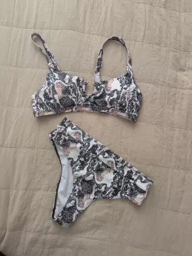 Zabudowane bikini z marszczonym topem świetnie sprawdza się na plaży i przy basenie. Dzięki elastycznej tkaninie dopasowuje się do sylwetki, zapewniając komfort i swobodę ruchów. Marszczony top dodaje charakteru, a jednocześnie stabilnie podtrzymuje biust. Konstrukcja kostiumu oferuje optymalne zakrycie, co zwiększa poczucie bezpieczeństwa podczas aktywności w wodzie. Wysokiej jakości materiał gwarantuje trwałość i odporność na działanie chloru oraz promieni UV, co czyni go praktycznym wyborem na lato.