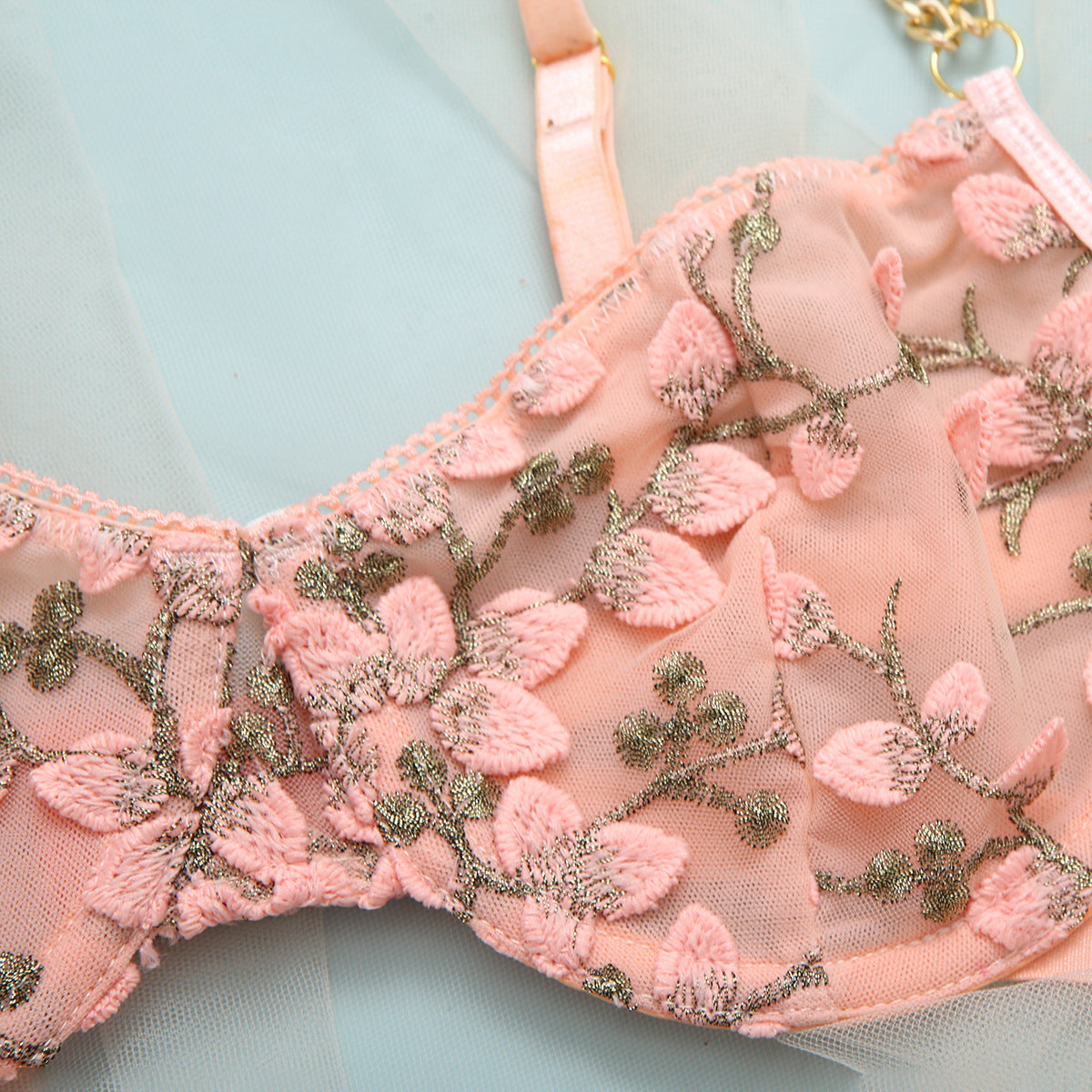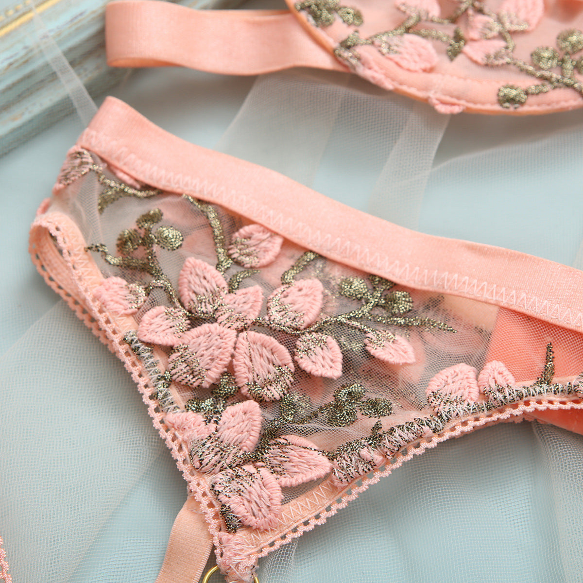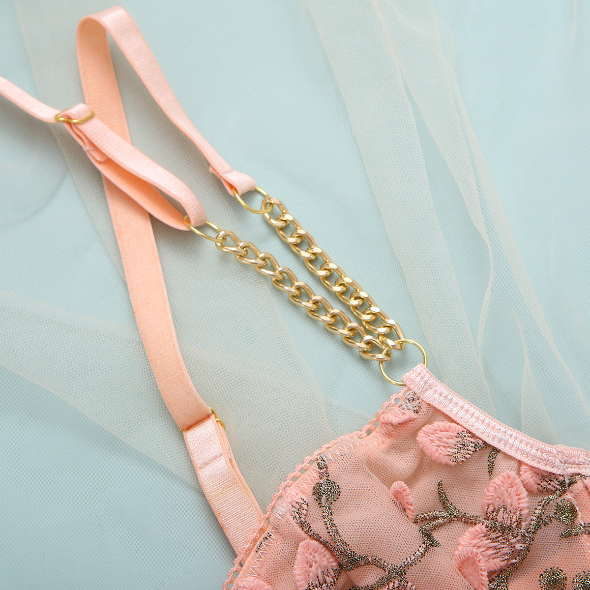 Haftowany zestaw z łańcuszkiem to starannie zaprojektowany komplet bielizny, który składa się z biustonosza i dopasowanych majtek. Haftowane wzory dodają mu wyrafinowanego charakteru, a nowoczesny krój podkreśla naturalne kształty sylwetki. Regulowane ramiączka i elastyczne tasiemki zapewniają wygodne dopasowanie, co zwiększa komfort noszenia. Materiał, z którego wykonano zestaw, charakteryzuje się miękkością i trwałością, co czyni go odpowiednim wyborem na różnorodne okazje.
