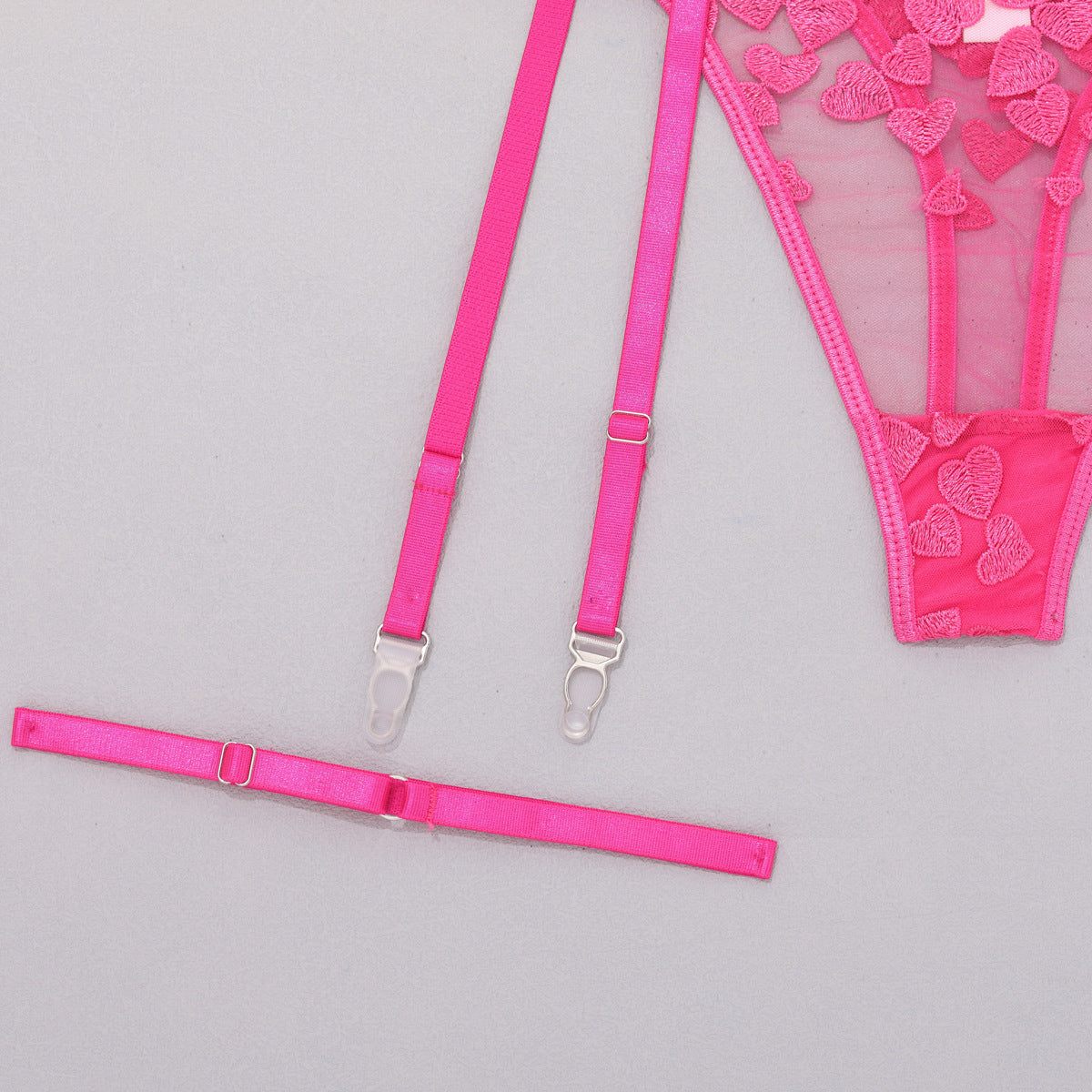 Czteroczęściowy zestaw bielizny składa się z biustonosza, majtek oraz pasa do pończoch, oferując szerokie możliwości stylizacji. Wykorzystanie delikatnych materiałów, takich jak koronka, zapewnia komfort noszenia i estetyczny wygląd. Starannie dobrane detale podkreślają kobiece kształty, a subtelne aplikacje dodają całości elegancji. Zestaw ten sprawdzi się zarówno na co dzień, jak i na specjalne okazje, zapewniając wygodę i styl. Idealny dla kobiet ceniących jakość i gustowne wykończenie.